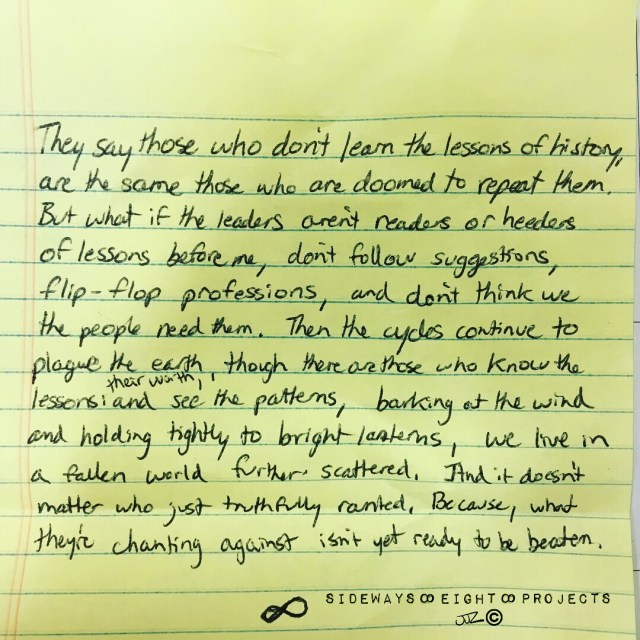 They say those who don’t learn the lessons of history are doomed to repeat them. But what if the leaders aren’t readers or heeders of lessons before me, don’t follow suggestions, flip-flop professions, and don’t think the people need them. Then the cycles continue to plague the earth, though there are those who know the lessons, their worth, and see the patterns, barking at the wind and holding tightly to lanterns. We live in a fallen world, scattered, and it doesn’t matter who just truthfully ranted. Because, what they’re chanting against isn’t yet ready to be beaten.