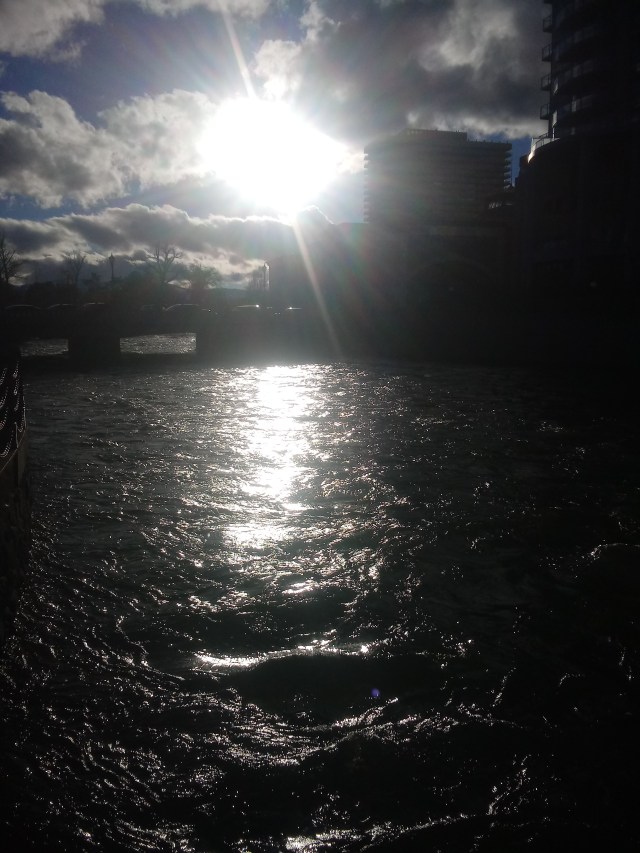 Hood up, headphones in, listening to the lines of the play, I am struck and stopped, by the light cropped by the tops of the signposts along my way.