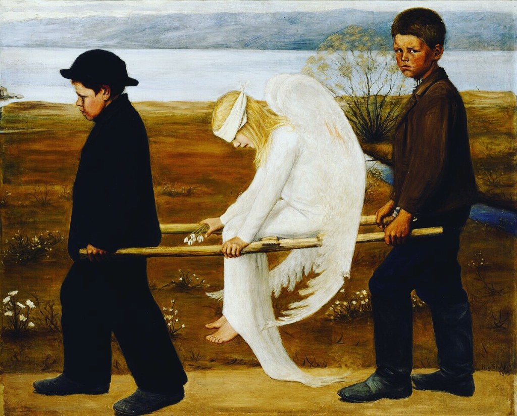 The Wounded Angel (Finnish: Haavoittunut enkeli) (1903) is a painting by Finnish symbolist painter Hugo Simberg. It is one of the most recognizable of Simberg’s works, and was voted Finland’s “national painting” in a vote held by the Ateneum art museum in 2006.