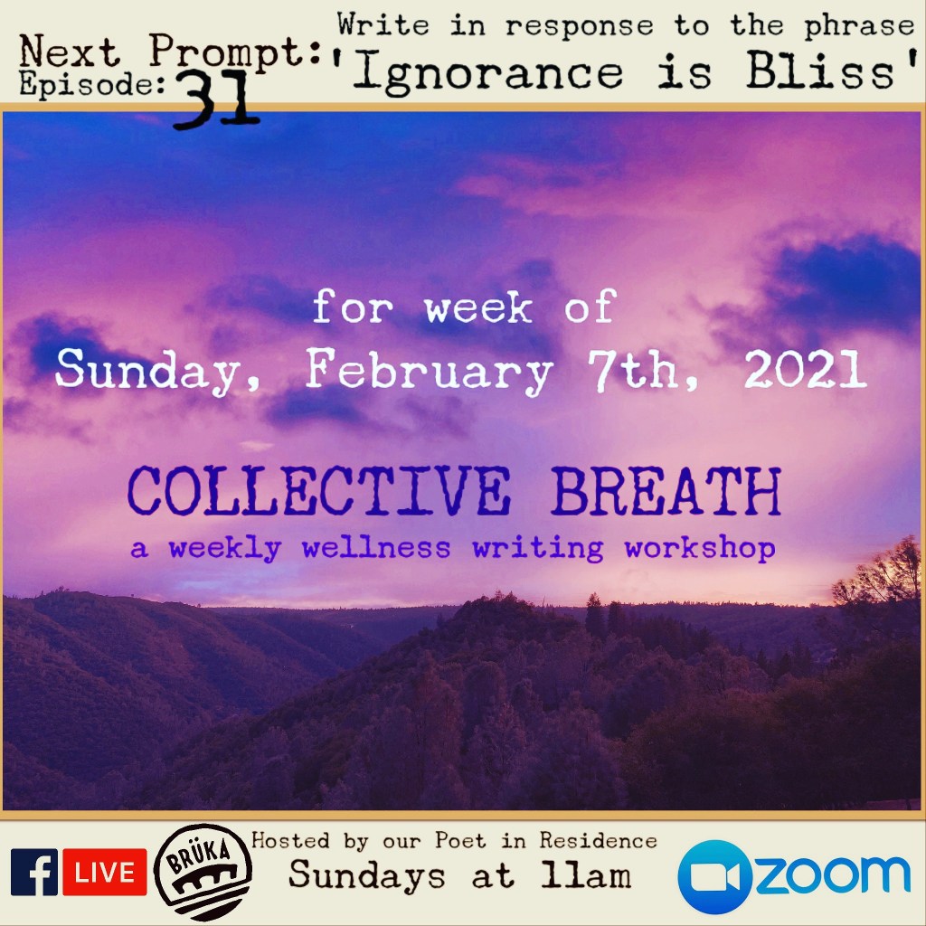 11:15am – Using the link provided in the Facebook Event “Collective Breath”, join on Zoom for the meeting to discuss and share creative output related to the Topic/Prompt. (Group Workshop Portion)