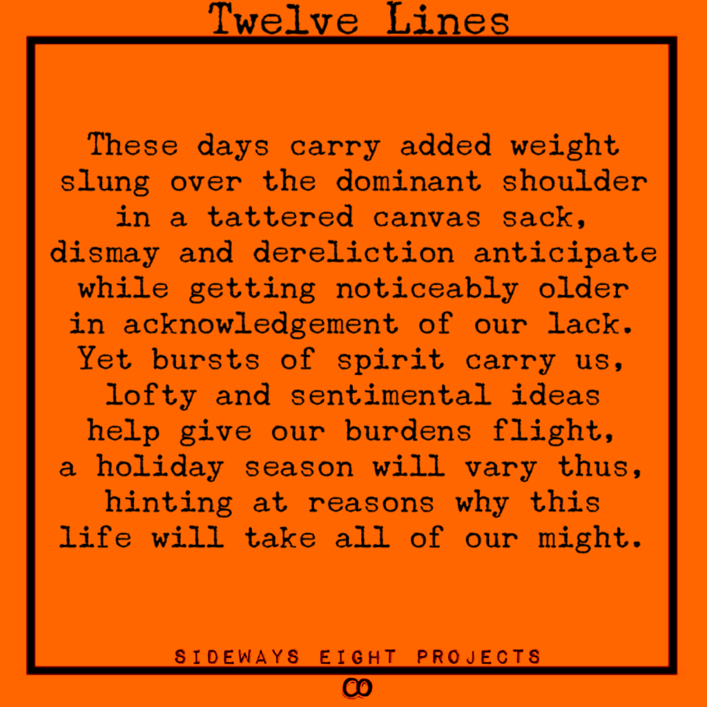 Whereas the number seven represents completion in certain numerology circles, the number eight represents a new beginning. Here at Sideways Eight Projects, I try to focus on art with forever in mind, as well as having a beginners mind for the sake of beginning anew. I wish for each of you to begin anew this year, as best you can given the individual circumstances you are bound by.